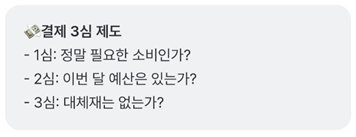 자신은 평소에 과소비를 하지 않는, 즉 합리적인 소비를 하 는 사람이라 점을 강조하는 말이다. 하지만 이런 말을 여 러 번 사용한다면 어불성설이다. 심사숙고해서 결정을 내렸을 때 “큰맘 먹고 한다!”라고 표현하는데, 이 말을 자 주 사용하는 게 말이 되는가? 만약 여러분이 이 말을 습관 적으로 사용하는 말버릇이 있다면, 좀 더 신중해야 하는데 도 불구하고 그런 심사숙고의 과정 없이 말만 먼저 앞서가 는 것은 아닌지 되돌아볼 필요가 있다. 만약 자신이 이런 잘못된 말버릇으로 불필요한 소비를 반복한다면 소비 전에 아래 결제 3심 제도를 거치길 추천한다.