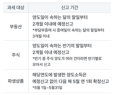 양도세 신고는 종합부동산세처럼 딱 정해진 기간이 없어요. 양도로 인한 소득이 발생했을 때를 기준으로 하기 때문이에요. 다만, 양도한 재산의 종류에 따라 신고 기간이 조금씩 달라요.