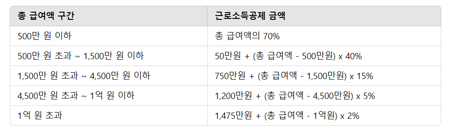 근로소득 공제금액은 근로소득자에게 일괄적으로 공제해주는 항목으로, 다음과 같이 총 급여액 구간에 따라 차등 적용돼요.