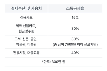 문화비로 쓴 비용은 신용카드 등 사용액에 포함됩니다. 신용카드 등 사용액으로 지출한 비용이 총 급여의 25%를 초과하면 그 초과분부터 소득공제 대상에 해당됩니다. 결제 수단별, 결제처별로 공제율이 조금씩 다른데요. 중요한 건 문화비 소득공제를 받을 수 있는 소득기준이 존재한다는 것입니다. 문화비 소득공제는 총 급여 7천 만 원 이하의 근로자에게만 해당하는 혜택으로 총 급여가 7천 만 원을 초과한다면 소득공제 혜택을 볼 수 없습니다.