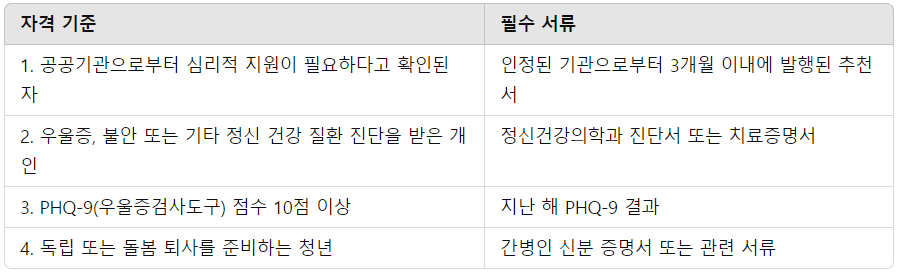 전 국민이 모두 이용할 수 있지만, 이 지원 제도의 취지에 적합하다는 진단이 있어야 합니다. 지원대상의 특정 자격 기준과 그에 따른 필요 서류는 아래 표와 같습니다.