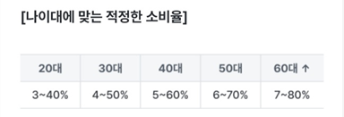 여기 나이대별 적정한 혈압 지표가 있듯 나이대에 맞는 적정한 소비율 지표가 있다. 소득과 상황에 따라 다르겠지만 나이대별 적정 소비율을 유지하기 위한 노력은 정말 중요하며, 나이가 젊을 때 더 낮은 혈압이 요구되는 것처럼 소비율 또한 젊을수록 낮게 유지되어야 한다는 사실만은 꼭 명심하자.