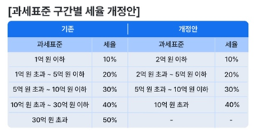 50%였던 최고세율을 40%로 낮추고 하위 과세표준 구간을 확대하는 게 핵심이에요. 최저세율 10%가 적용되는 구간이 확대되면서 과세표준 1억 원 초과~2억 원 이하 구간의 상속세의 적용받는 세율은 20%에서 10%로 낮아지게 돼요.